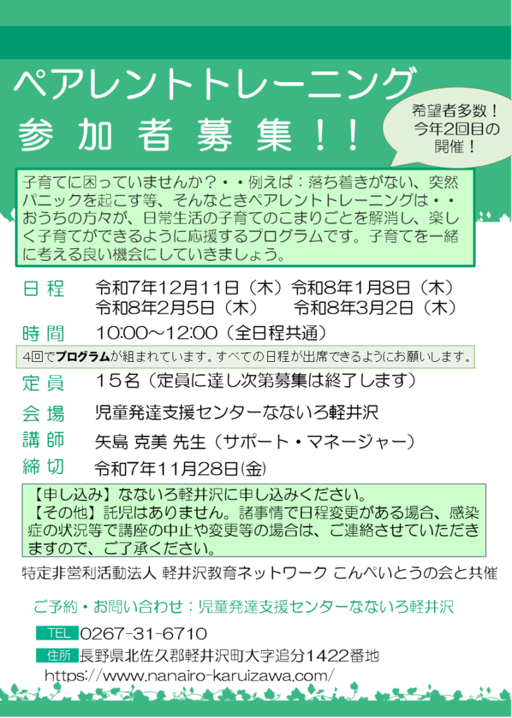 この度、今年度第2回目となるペアレントトレーニングをこんぺいとうの会との共催により開催いたします。全4回のプログラムとなっています。下記日程をご確認の上、ご参加ください。